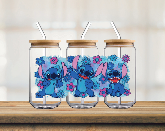 Stitch blue w/ Flowers | UV DTF 16oz Glass Can Wrap